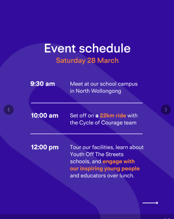 Enjoy a morning of cycling the beautiful coastal pathways of the Illawarra region with the students from our Cycle of Courage team. You'll then get to tour our new school facilities at Craig Davis College in North Wollongong, meet our educators and enjoy a relaxed catered lunch.